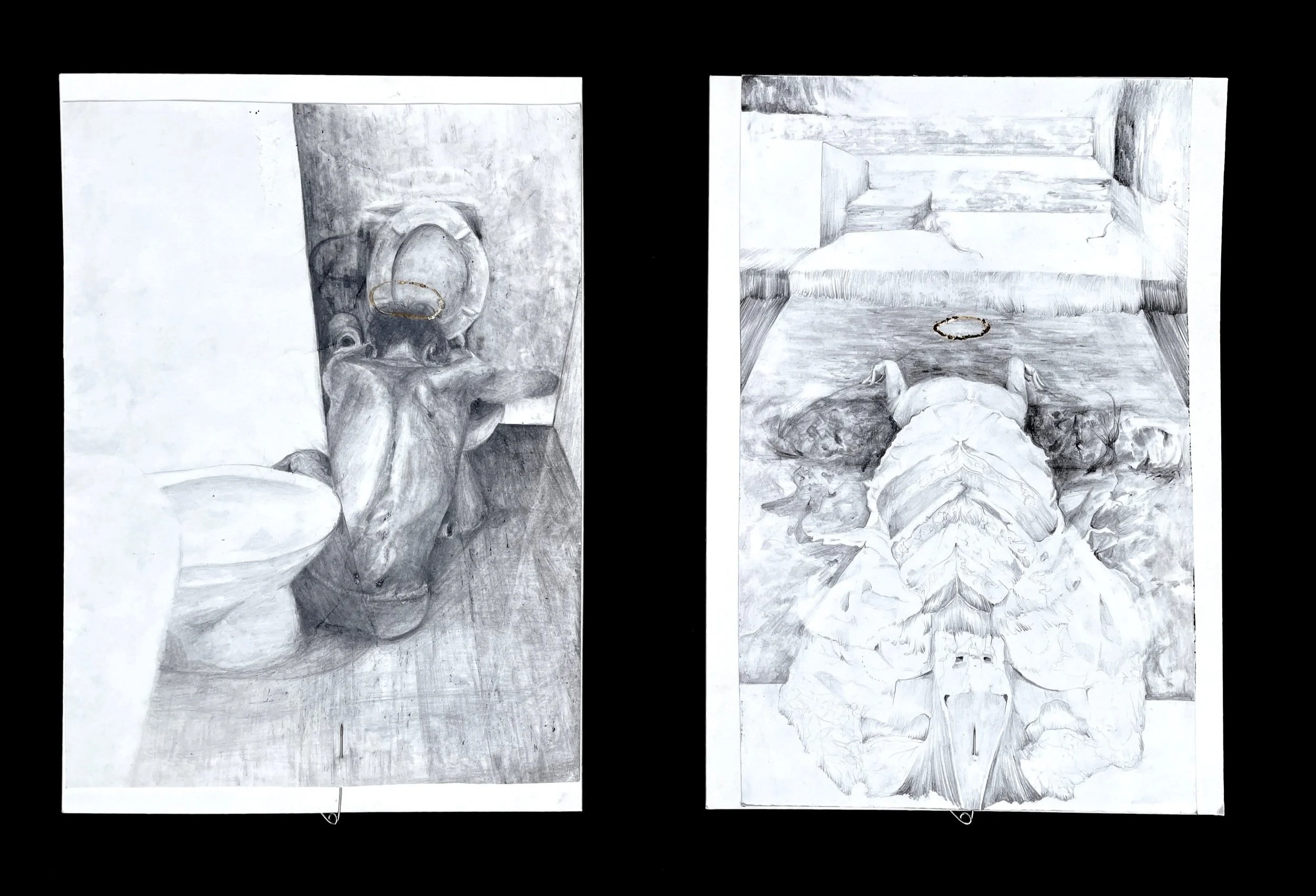 Diptych (Beltway River), graphite, gold leaf and safety pin on paper, 47 x 30 cm